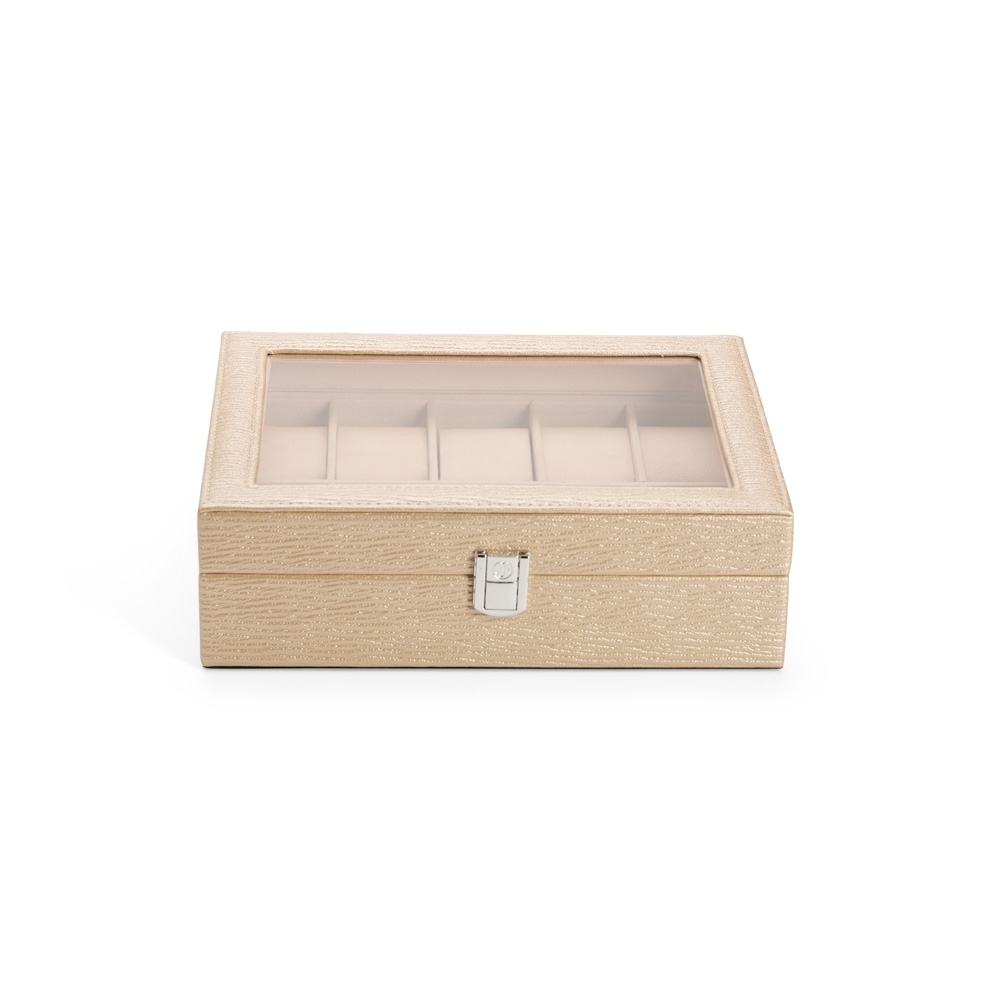 Porta-relógios com acabamento texturizado em couro sintético à base de PVC e revestimento interno em tecido aveludado. Possui dez divisórias com almofadas removíveis, visor de vidro e trava de segurança na tampa.