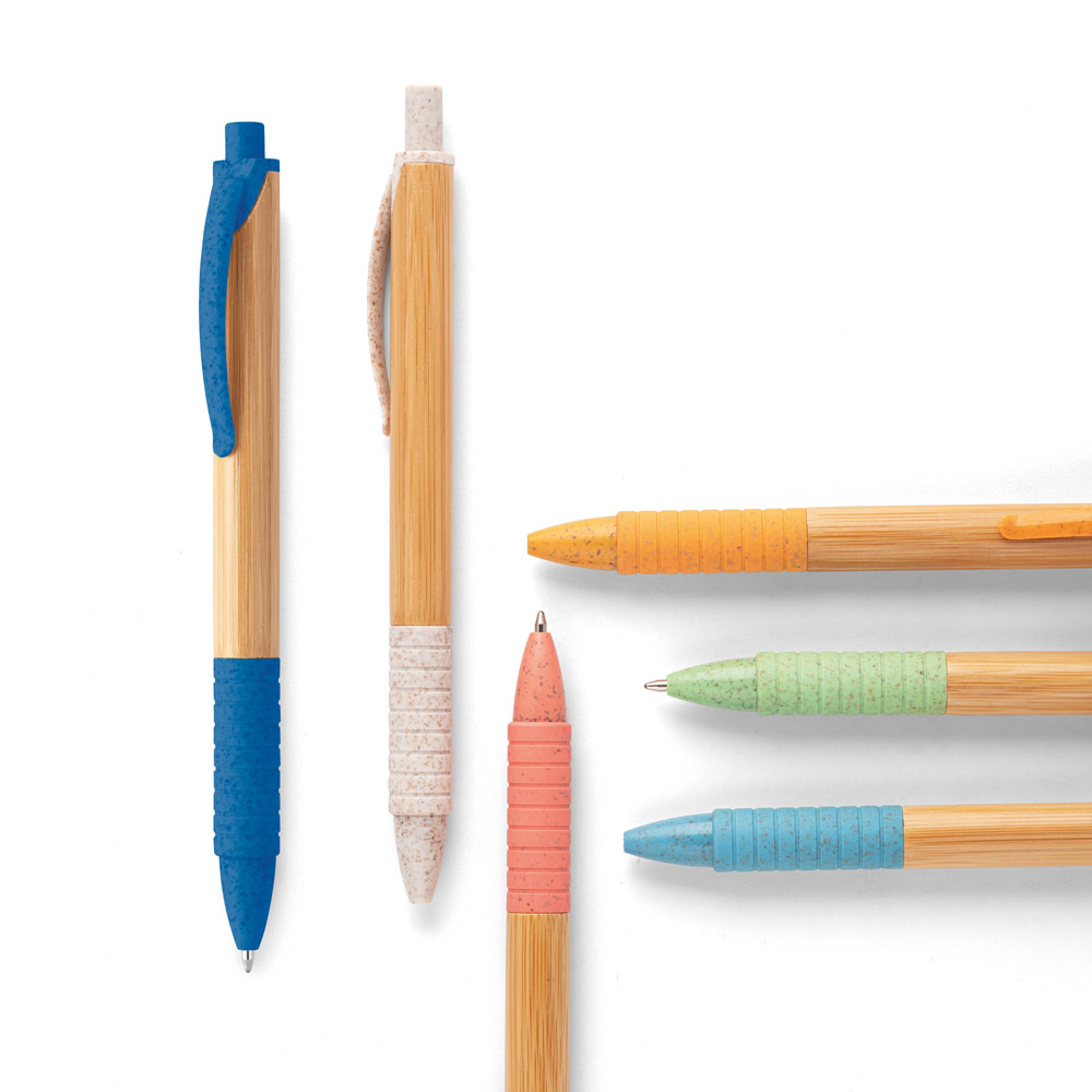 Esferográfica em bambu com clipe, antideslizante e elementos coloridos em fibra de trigo e ABS. Escrita em azul. A cor e o resultado da impressão nos materiais naturais pode variar entre produtos. ø11 x 142 mm