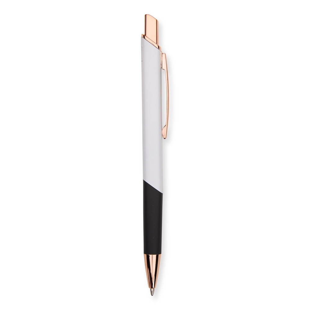 Caneta feita inteiramente em metal com acionamento por clique e carga esferográfica azul de 1,0mm.