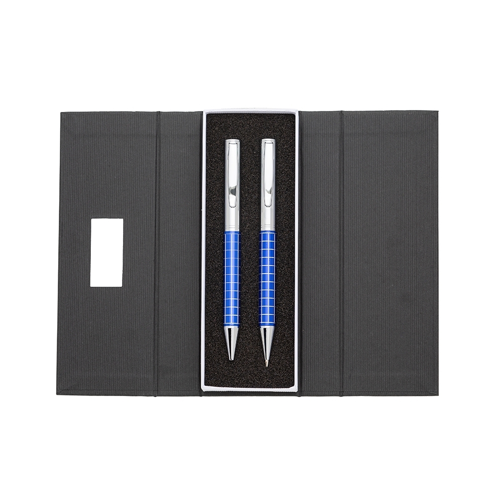 Kit caneta e lapiseira de metal em estojo papelão com placa de metal(parte interna do estojo revestida com espuma). Caneta e lapiseira prata com detalhes coloridos e quadriculados, clip metal com anel superior na ponta e dois anéis centrais e acionam por giro.