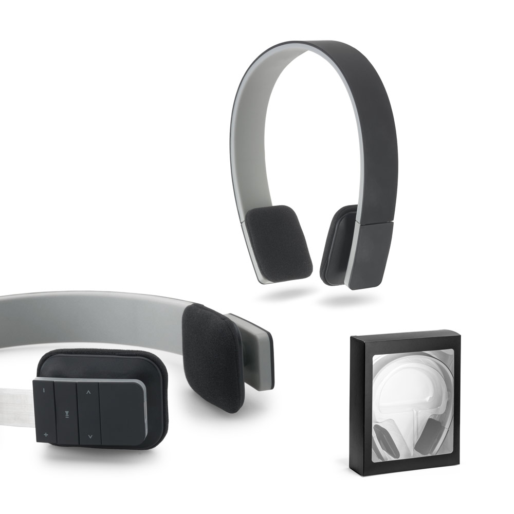 Fones de ouvido ajustáveis em ABS, com acabamento emborrachado. Possui transmissão sem fios BT v4.1 e autonomia, aproximada, de 5 h. Possui função para atender chamadas, controle de volume e conexão à playlist do dispositivo móvel. Incluso cabo USB para carregar. Fornecido em caixa presente