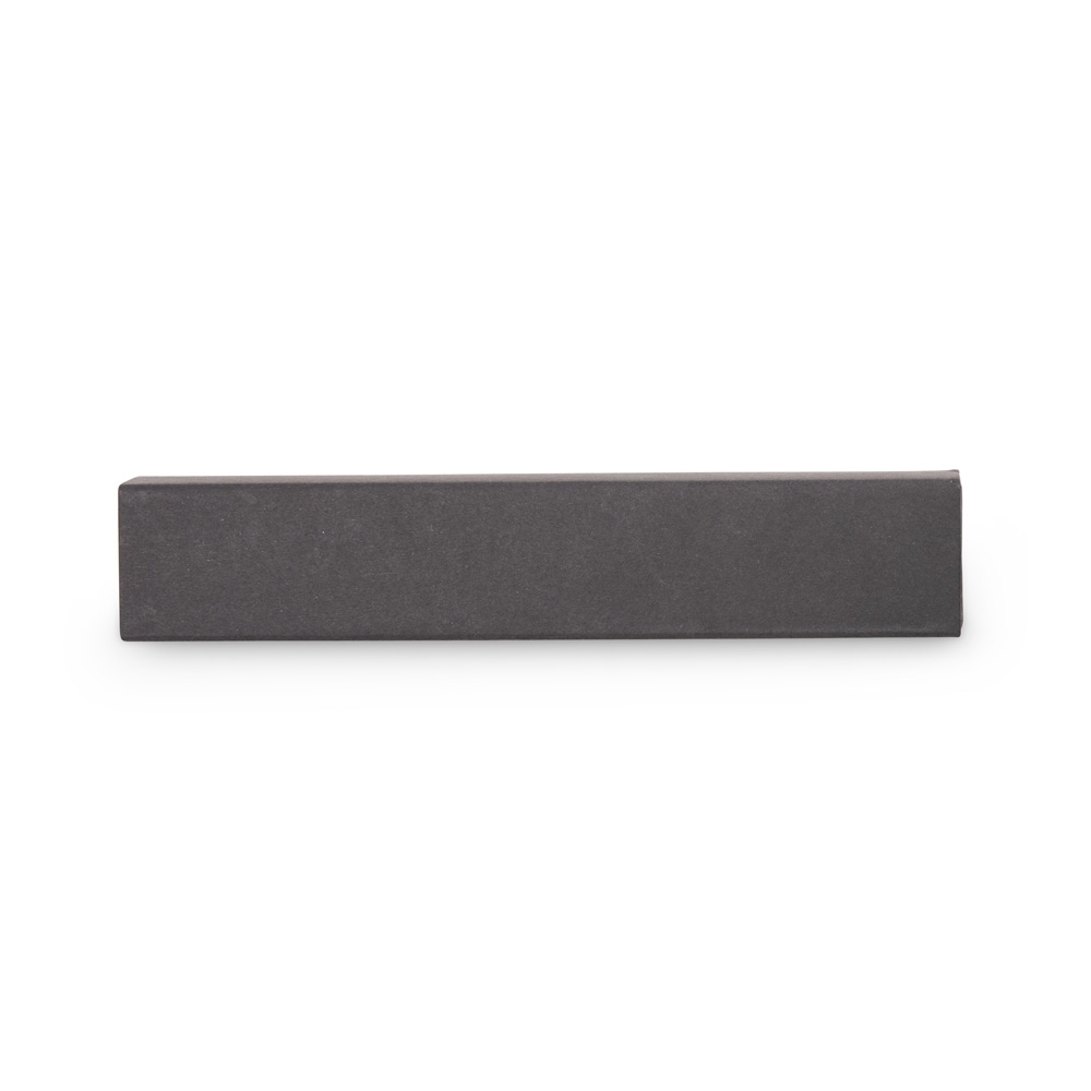 Estojo em papelão com abertura estilo gaveta e berço aveludado e elástico para fixar uma caneta.